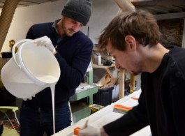 Martin Guyot et Pierre Girard ont commencé comme staffeurs ornemanistes en 2013, après une formation aux techniques traditionnelles du moulage. Puis, Pierre se tourne vers la restauration de monuments historiques et la réalisation d’ensembles décoratifs monumentaux. Martin, quant à lui, a collaboré avec des artistes contemporains, de la conception 3D à la réalisation de leurs œuvres. L’Atelier Revery met aujourd’hui leurs savoir-faire au service de la création d’objets d’art et de décors à destination des artistes, des architectes et des designers.